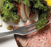 Kale Salad: In large bowl, whisk together ¼ cup (50 mL) vegetable oil, 1 clove garlic, pressed, 2 tbsp (30 mL) red wine or white balsamic vinegar, 1 tbsp (15 mL) EACH Dijon mustard and maple syrup, ¼ tsp (1 mL) EACH salt and pepper. Add 4 cups (1 L) baby kale or torn kale leaves (stems removed), ¼ cup (50 mL) EACH pumpkin seeds and dried cranberries and 1 small apple cut into slices. Toss and serve or let stand up to 1 hour before serving.
